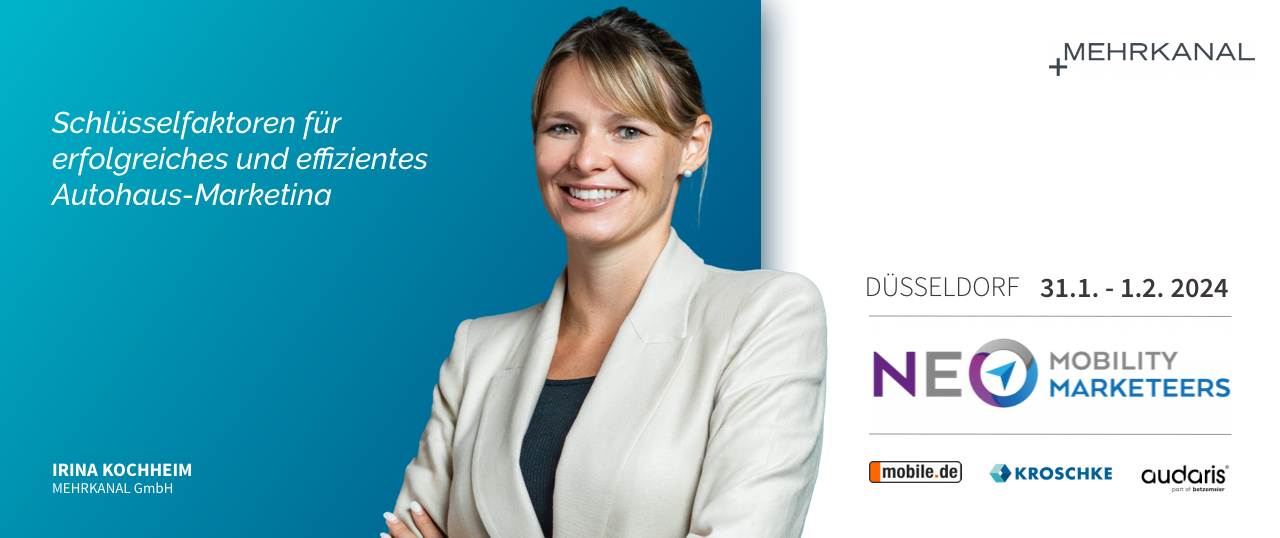 Als Partner und Experte in der Automobilbranche unterstützt die MEHRKANAL GmbH, der führende Lösungsanbieter für Marketing aus Essen, diese Fachveranstaltung. Irina Kochheim, Consultant bei MEHRKANAL, erläutert dort die Schlüsselfaktoren für erfolgreiches und effizientes Autohaus-Marketing. Gemeinsam mit Crispin Dohrmann (mobile.de), Philipp Kroschke (Kroschke Gruppe) und Maximilian Betzemeier (audaris GmbH) erklärt sie, wie Autohäuser ihre Marketingmaßnahmen schneller und leichter auf die Straße bringen und so aus Leads Kunden werden. Dabei wird MEHRKANAL besonders auf die Vorteile von automatisierten Prozessen im Marketing eingehen. Schwerpunkte sind hier die Themen „Omnichannel Marketing", „ki-basierte Marketingstrategien" sowie „Fahrzeugverkauf online".